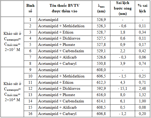 Nghiên cứu ảnh hưởng của 7 loại thuốc bảo vệ thực vật khác với nồng độ được thêm vào bằng nồng độ của acetamiprid đến sự thay đổi bước sóng cực đại của dung dịch AuNPs-PDADMAC có chứa acetamiprid. Kết quả thu được (Bảng 2) cho thấy, mức sai lệch của bước sóng hấp thụ cực đại đều nhỏ hơn 3%, do đó, có thể bỏ qua sự ảnh hưởng của các thuốc bảo vệ thực vật khác đến kết quả đo hàm lượng acetamiprid trong dung dịch AuNPs-PDADMAC.