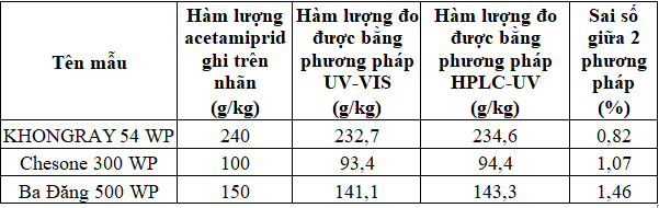 Kết quả phân tích một số mẫu thuốc trừ sâu chứa acetamiprid bằng phương pháp UV-VIS và đối chứng với phương pháp HPLC-UV (hệ thống sắc ký lỏng Waters Alliance e2695 với detector PDA) [12] được cho trong Bảng 3. Kết quả cho thấy, sự khác nhau giữa hai phương pháp không đáng kể (từ 0,82% đến 1,46%), cho thấy phương pháp nghiên cứu cho độ tin cậy cao.