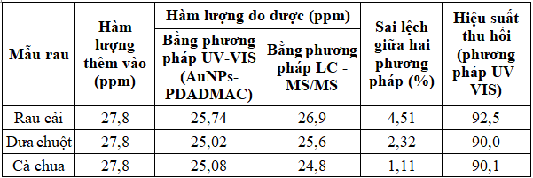 Kết quả phân tích một số mẫu trắng của rau củ quả được thêm chuẩn acetamiprid bằng phương pháp UV-VIS và đối chứng với phương pháp LC - MS/MS (hệ thống sắc ký lỏng khối phổ LC-MS/MS với hệ thống HPLC 20 AXL của Shimadzu và khối phổ ABI 6500 QQQ của Aplied Biosystem) [13] được cho trong Bảng 4. Kết quả cho thấy, sự khác nhau giữa hai phương pháp nhỏ hơn 5%. Mặt khác, hiệu suất thu hồi của phương pháp nghiên cứu đạt trên 90%, đáp ứng yêu cầu phân tích thực tế.