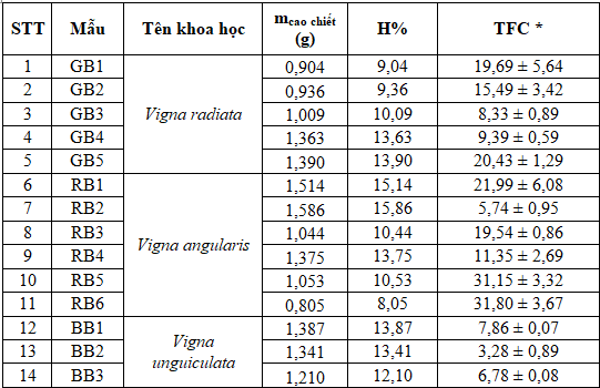 Hiệu suất chiết các mẫu đậu thuộc bốn loài phổ biến được trình bày trong Bảng 1. Kết quả phân tích cho thấy, không có sự khác biệt đáng kể về hiệu suất chiết giữa các mẫu thuộc bốn loài này (p > 0,05). Các loại đậu đều chứa một lượng đáng kể các hợp chất sơ cấp (protein, lipid, carbohydrat) cũng như nhiều hợp chất thứ cấp khác, do đó, hiệu suất tạo cao chiết tổng số có thể ít khác biệt giữa các loài trong nghiên cứu này.