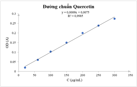 * TFC được thể hiện dưới dạng giá trị trung bình ± độ lệch chuẩn của ba lần lặp lại thí nghiệm, đơn vị tính mg QE/g cao chiết. Đường chuẩn quercetin có phương trình y = 0,0009x + 0,0075 với hệ số tương quan R² = 0,9985 đảm bảo độ tuyến tính cho việc định lượng flavonoid tổng số trong các mẫu nghiên cứu.
