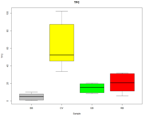 Hình 2. Biểu đồ hộp so sánh hàm lượng flavonoid tổng số (TFC) của bốn nhóm mẫu: đậu đen (BB), đậu cove (CV), đậu xanh (GB), đậu đỏ (RB)