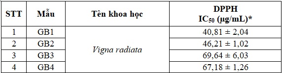 Trong nghiên cứu này, bên cạnh việc xác định hàm lượng flavonoid tổng số, chúng tôi cũng đánh giá hoạt tính chống gốc tự do DPPH của các cao chiết từ các loại đậu đã thu thập. Kết quả được trình bày trong Bảng 2.