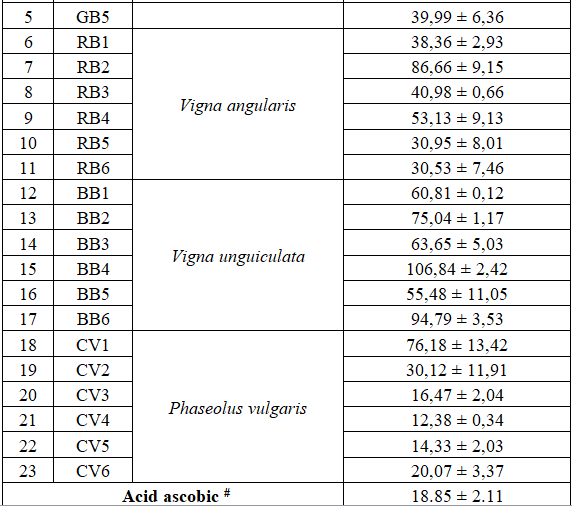 Nhìn chung, các mẫu cao chiết từ bốn loại đậu đều thể hiện hoạt tính thu dọn gốc tự do DPPH ở các mức độ khác nhau. Kết quả phân tích phương sai ANOVA cho thấy, giá trị IC50 của cao chiết từ các mẫu đậu cove (Phaseolus vulgaris) thấp hơn một cách có ý nghĩa thống kê (p < 0,05) so với các mẫu còn lại, trong khi giá trị này của các mẫu cao chiết từ đậu xanh (Vigna radiata) đậu đen (Vigna unguiculata) và đậu đỏ (Vigna angularis) không có sự khác biệt đáng kể (p > 0,05). Xu hướng này phù hợp với kết quả định lượng flavonoid tổng số trong các mẫu thí nghiệm. Đáng chú ý, ba mẫu cao chiết CV3, CV4, và CV5 thể hiện hoạt tính mạnh hơn (giá trị IC50 thấp hơn) chất đối chứng dương là acid ascobic. Đây cũng là ba mẫu có hàm lượng flavonoid tổng số cao nhất. Các mẫu có hàm lượng flavonoid cao hơn thường thể hiện hoạt tính chống gốc tự do DPPH mạnh hơn bởi các hợp chất flavonoid, với cấu trúc chứa một hay nhiều nhóm phenol, chúng thường thể hiện hoạt tính chống gốc tự do, chống oxi mạnh.