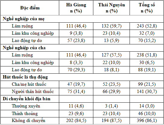 Tổng số có 459 đối tượng tham gia nghiên cứu, trong đó Thái Nguyên có 220 đối tượng (106 nam, 114 nữ), Hà Giang có 239 đối tượng (118 nam, 121 nữ) tham gia nghiên cứu. Kết quả thu thập được cho thấy cha/mẹ tại hai địa điểm có nghề nghiệp chủ yếu là lao động tự do hoặc làm ruộng. Cụ thể, tại Hà Giang mẹ của trẻ đa số có nghề nghiệp là làm ruộng (46,4%) và lao động tự do (23,8%), còn bố của trẻ có nghề nghiệp là làm ruộng chiếm 46,4%, lao động tự do 29,3%. Tại Thái Nguyên nơi có nhiều khu công nghiệp, tỷ lệ cha/mẹ trẻ làm tại đây cũng cao hơn so với Hà Giang, tuy nhiên cũng chỉ chiếm tỷ lệ khoảng 10%. Các ngành nghề khác như y tế, giáo viên, viên chức chiếm tỷ lệ thấp (Bảng 1).
