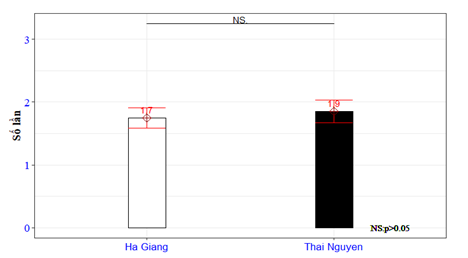 Thông tin tiền sử bệnh lý hô hấp của trẻ: Viêm VA là tiền sử thường gặp nhất với tỷ lệ 37,3%, viêm tai giữa (11,5%), sốt phát ban (8,1%). Tỷ lệ Viêm VA tại Thái Nguyên là 41,4%, Hà Giang là 33,5%. Các tiền sử bệnh lý khác như hen phế quản, viêm xoang chiếm tỷ lệ thấp hơn (Bảng 2). Chúng tôi khảo sát số liệu về tần số mắc cảm cúm/ năm gần nhất trung bình tại Hà Giang 1,7 lần/năm, tại Thái Nguyên 1,9 lần/ năm (Biểu đồ 1). Tuy sự khác biệt không có ý nghĩa thống kê, nhưng số liệu cho thấy xu hướng có số lần mắc cao hơn ở Thái Nguyên, so với Hà Giang.
