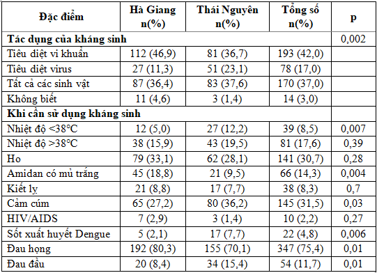 Kết quả hiểu biết về kháng sinh: có 42% phụ huynh biết tác dụng của kháng sinh là tiêu diệt vi khuẩn, tỷ lệ này tại Hà Giang là 46,9%, Thái Nguyên là 36,8% và sự khác biệt giữa hai địa điểm nghiên cứu có ý nghĩa thống kê với p<0,05. Có tới 23,2% người được điều tra tại Thái Nguyên cho rằng kháng sinh có thể tiêu diệt được virus, tại Hà Giang tỷ lệ này chỉ là 11,3%. Khi phỏng vấn sử dụng kháng sinh trong các bệnh lý nào thì có nhiều đối tượng tham gia nghiên cứu lựa chọn sử dụng kháng sinh trong các trường hợp cảm cúm (31,6%), đau đầu (11,8%), HIV/AIDS (2,2%) và đa số cho rằng khi đau họng là sẽ sử dụng kháng sinh, sự khác biệt giữa hai địa điểm nghiên cứu có ý nghĩa thống kê với p<0,05. Kết quả trên cho thấy, cha/mẹ trẻ có ít kiến thức về công dụng cũng như chỉ định của kháng sinh, dễ dẫn tới tình trạng lạm dụng kháng sinh cho trẻ. Trong bối cảnh tiếp cận các dịch vụ y tế tại các khu vực miền núi còn khó khăn do địa hình và điều kiện kinh tế, việc sử dụng sai hoặc lạm dụng kháng sinh cho các trường hợp không cần thiết dẫn tới hệ quả lãng phí về mặt kinh tế và gia tăng tình trạng kháng kháng sinh. Các nghiên cứu khác trên thế giới cũng cho thấy việc lạm dụng và không tuân thủ hướng dẫn sử dụng kháng sinh là nguyên nhân chính dẫn tới tình trạng kháng kháng sinh, lãng phí và đạt hiệu quả kém trong điều trị [19, 20].