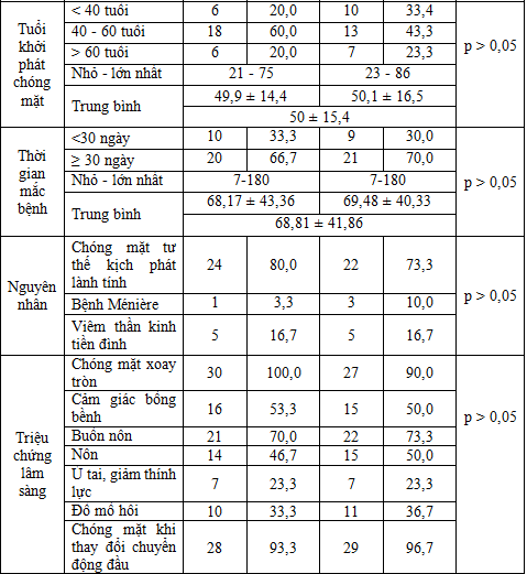 Kết quả nghiên cứu Bảng 1 cho thấy: Tuổi trung bình của bệnh nhân chóng mặt ngoại biên là 51,5 ± 14,9 tuổi, nhỏ nhất là 22 tuổi và lớn nhất là 91 tuổi, bệnh nhân ≥ 40 tuổi chiếm tỷ lệ cao (80%) ở cả 2 nhóm. Tỉ lệ nam giới : nữ giới là 1 : 2,75; gặp ở nhiều nghề nghiệp khác nhau và không ghi nhận tiền căn chiếm tỷ lệ cao. Phân bố tỷ lệ bệnh nhân theo lứa tuổi, giới, nghề nghiệp, tiền căn trước điều trị giữa 2 nhóm không có sự khác biệt (p > 0,05). Kết quả của chúng tôi phù hợp với Phan Kim Ngân [6] nghiên cứu trên 116 bệnh nhân chóng mặt ngoại biên ghi nhận tuổi trung bình là 57,53 ± 14,75 tuổi, nhỏ nhất là 26 tuổi và lớn nhất là 87 tuổi, ≥ 40 tuổi chiếm tỷ lệ 82,8%, tỉ lệ nam giới : nữ giới là 1 : 2,63, không ghi nhận tiền căn chiếm tỷ lệ 63,8% và tác giả Bunasuvan P [7] tổng kết 149 bệnh nhân chóng mặt ngoại biên ghi nhận tuổi trung bình là 55 tuổi, tỉ lệ nam giới : nữ giới là 1 : 2. Như vậy, chóng mặt ngoại biên có thể gặp ở mọi lứa tuổi và ≥ 40 tuổi chiếm tỷ lệ cao; bệnh gặp ở nhiều nghề nghiệp khác nhau, tỷ lệ nữ giới chiếm ưu thế hơn so với nam giới và bệnh nhân không ghi nhận tiền căn chiếm tỷ lệ cao.
