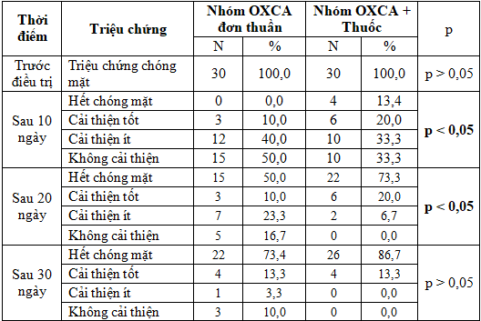 - Mức độ cải thiện chóng mặt sau điều trị của 2 nhóm đều có kết quả tốt và có ý nghĩa thống kê (p < 0,05). So sánh hiệu quả điều trị giữa 2 nhóm cho thấy: nhóm OXCA kết hợp thuốc có tỷ lệ cải thiện cao hơn và thời gian cải thiện nhanh hơn nhóm OXCA đơn thuần (p < 0,05), tuy nhiên sau 30 ngày điều trị sự khác biệt không có ý nghĩa thống kê (p > 0,05).