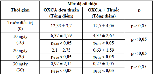 - Hiệu quả điều trị tăng theo số giờ điều trị. Ở nhóm điều trị OXCA kết hợp thuốc tổng số điểm trung bình trước điều trị là 12,5 điểm, sau 10 ngày điều trị là 4,37 điểm, sau 20 ngày điều trị giảm còn 0,63 điểm và sau 30 ngày điều trị chỉ còn 0,27 điểm (p < 0,05). Nhóm điều trị OXCA đơn thuần tỷ lệ này lần lượt là 12,33 điểm; 6,37 điểm; 2,1 điểm và 0,97 điểm (p < 0,05).