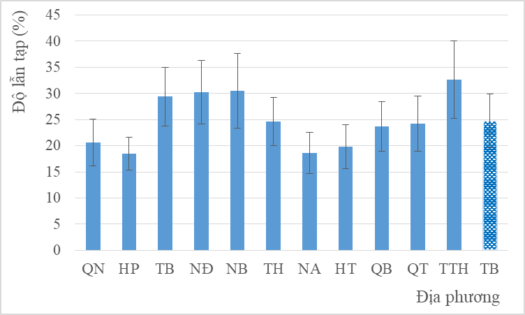 Kết quả từ Hình 2 cho thấy, các mẫu rong câu nguyên liệu thu được từ 11 địa phương khu vực miền Bắc có độ lẫn tạp chất khá cao, trung bình đạt 24,8 ± 5,2% về khối lượng. Các tỉnh có tỷ lệ lẫn tạp chất cao nhất trong rong câu nguyên liệu có thể kể đến là Thừa Thiên Huế là 32,6 ± 7,4%; Ninh Bình 30,5 ± 7,2%; Nam Định 30,2 ± 6,1%; Thái Bình 29,4 ± 5,6%. Các tỉnh Thanh Hóa (24,6 ± 4,6%), Quảng Trị (24,2 ± 5,3%), Quảng Bình (23,7 ± 4,8%) có độ lẫn tạp chất trong rong câu nguyên liệu đạt mức trung bình. Độ lẫn tạp chất trong các mẫu rong câu nguyên liệu thu được có tỷ lệ ít hơn tại Hải Phòng (18,5 ± 3,2%), Nghệ An (18,6 ± 3,9%), Hà Tĩnh (19,8 ± 4,2%) và Quảng Ninh (20,6 ± 4,5%). Tuy vậy, đây vẫn là độ lẫn tạp chất rất cao trong rong câu nguyên liệu khi so sánh với các quy định, tiêu chuẩn về rong câu nguyên liệu. Theo quy định tại Tiêu chuẩn Việt Nam TCVN 3590 - 88 [8]: Rong câu và Aga, hàm lượng tạp chất tính theo % khối lượng của các mức hạng chất lượng rong câu nguyên liệu từ 1 đến 3 không được lớn hơn từ 3% đến 7%. Như vậy, độ lẫn tạp chất trong rong câu nguyên liệu hiện nay tại các tỉnh ven biển phía Bắc là rất cao, cao gấp 3 - 5 lần theo quy định tại Tiêu chuẩn Việt Nam.