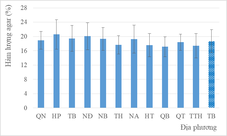 Kết quả phân tích thống kê với mức ý nghĩa p = 0,05 cho thấy, hàm lượng agar cao nhất ở các mẫu rong thu tại Hải Phòng, với hàm lượng trung bình đạt 20,6 ± 4,1%, tiếp theo đó là Nam Định 20,1 ± 3,8%; Thái Bình 19,5 ± 3,6%; Ninh Bình 19,3 ± 3,2%; Nghệ An 19,2 ± 3,9%; Quảng Ninh 19,0 ± 2,5%. Năm tỉnh còn lại là Thanh Hóa, Hà Tĩnh, Quảng Bình, Quảng Trị và Thừa Thiên Huế có hàm lượng agar trong các mẫu rong câu nguyên liệu thu được thấp hơn, trung bình dao động từ 17 đến 18%. Như vậy, với các mẫu rong câu nguyên liệu thu được cho thấy, hiện nay chất lượng rong câu nguyên liệu tại 11 tỉnh ven biển phía Bắc chỉ nằm trong khoảng giữa của hạng chất lượng hạng 3 (hàm lượng agar tính theo % khối lượng khô không nhỏ hơn 15%) và hạng 2 (hàm lượng agar tính theo % khối lượng khô không nhỏ hơn 20%) theo 3 mức phân hạng về chất lượng rong câu nguyên liệu [8]. Chỉ có 2/9 điểm thu mẫu tại Hải Phòng (tại phường Tân Thành và thị trấn Cát Hải) đạt chất lượng rong câu nguyên liệu hạng 1 (hàm lượng agar tính theo % khối lượng khô không nhỏ hơn 25%), còn 7/9 điểm thu mẫu tại Hải Phòng có chất lượng rong câu đạt hạng 2, 3.