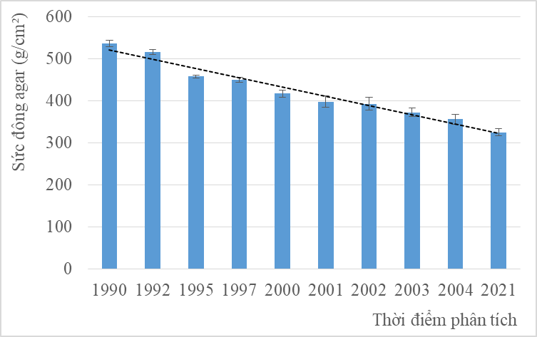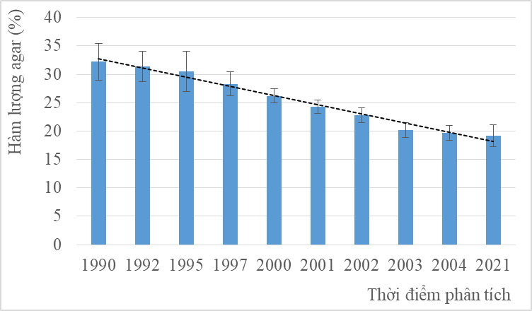 Từ Hình 4 cho thấy, chất lượng rong câu đã suy giảm theo thời gian nuôi trồng. Kết quả phân tích từ những năm 1990 cho thấy, chất lượng rong câu nguyên liệu còn khá tốt, trung bình hàm lượng agar đạt khoảng 32,2 ± 3,2% [13]. Đến năm 2000, chất lượng rong câu nguyên liệu còn khoảng 26,2 ± 1,2% [17]. Tuy nhiên hiện nay, kết quả phân tích tại khu vực này cho thấy, hàm lượng agar trong rong câu nguyên liệu chỉ còn khoảng 19,5 ± 1,9% (gần tương đương với kết quả phân tích năm 2004 là 19,7 ± 1,3%). Như vậy, sau khoảng hơn 30 năm, hàm lượng agar trong rong câu nguyên liệu đã suy giảm gần một nửa so với năm 1990 và gần như chững lại kể từ năm 2004 đến nay. Một trong những nguyên nhân chính là khi nuôi trồng rong câu trong ao đầm, hình thức sinh sản hữu tính của rong câu dần mất đi mà thay vào đó là hình thức sinh sản dinh dưỡng. Qua thời gian dài ngắt đoạn nhiều lần để nuôi trồng đã dẫn đến suy thoái về chất lượng nguồn giống [11].