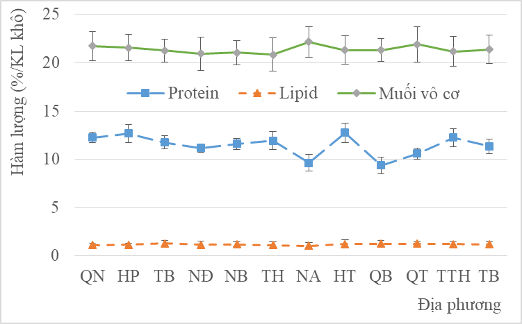 Kết quả phân tích, đánh giá một số chỉ tiêu về hàm lượng protein, lipid và hàm lượng muối vô cơ trong các mẫu rong câu nguyên liệu thu thập được tại các tỉnh ven biển phía Bắc cho thấy, rong câu nguyên liệu có thành phần dinh dưỡng đa dạng và phong phú. Kết quả phân tích thể hiện ở Hình 8.