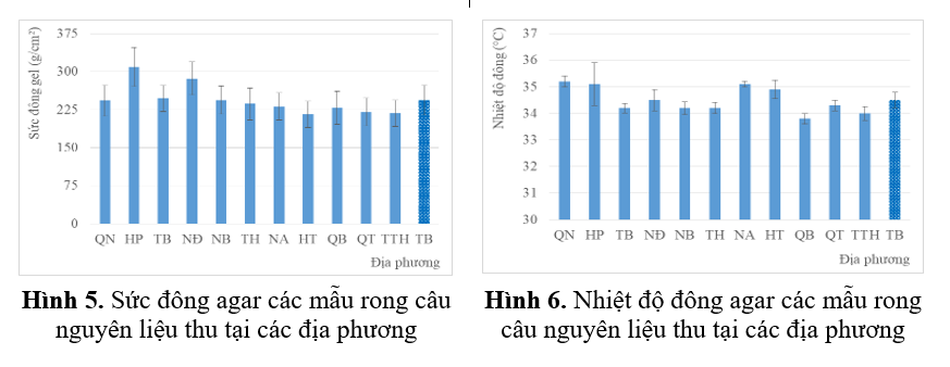 Từ Hình 5 cho thấy, sức đông của agar chiết xuất từ các mẫu rong câu nguyên liệu thu được tại các địa phương trung bình đạt 243,7 ± 29,6 g/cm2. Các mẫu rong câu có sức đông agar cao nhất thu được tại Hải Phòng đạt 309,3 ± 38,1 g/cm2; tiếp đến là các tỉnh Nam Định 286,4 ± 32,4 g/cm2; Thái Bình 247,3 ± 25,8 g/cm2; Ninh Bình 243,9 ± 27,9 g/cm2; Quảng Ninh 242,9 ± 30,5 g/cm2. Các tỉnh ven biển phía Bắc còn lại, sức đông agar chiết xuất từ các mẫu rong câu nguyên liệu thu thập được thấp hơn, dao động khoảng 215 - 235 g/cm2. Đối chiếu với Tiêu chuẩn Việt Nam [8], phần lớn sức đông agar thuộc mức chất lượng hạng 2 (Sức đông aga tính theo g/cm2 (ở nồng độ 1% và nhiệt độ 20oC) không nhỏ hơn 180 g/cm2). Chỉ một số mẫu rong câu thu được tại Hải Phòng, Nam Định, Thái Bình, Ninh Bình, Quảng Ninh có sức đông agar thuộc mức chất lượng hạng 1 (Sức đông aga tính theo g/cm2 (ở nồng độ 1% và nhiệt độ 20oC) không nhỏ hơn 250 g/cm2). Đặc biệt tại Cát Hải và Tân Thành (Hải Phòng), các mẫu rong câu nguyên liệu thu được vẫn có hàm lượng và chất lượng agar, sức đông agar cao hơn các tỉnh khác. Hải Phòng đã từng được xem là nơi cung cấp sản lượng rong lớn nhất cả nước, tuy nhiên hiện nay do các mục đích chuyển đổi sử dụng đất khác nhau nên sản lượng và chất lượng rong câu tại đây ngày càng giảm, sản lượng thu hoạch năm 2021 ước tính chỉ vào khoảng 50 - 80 tấn rong nguyên liệu.