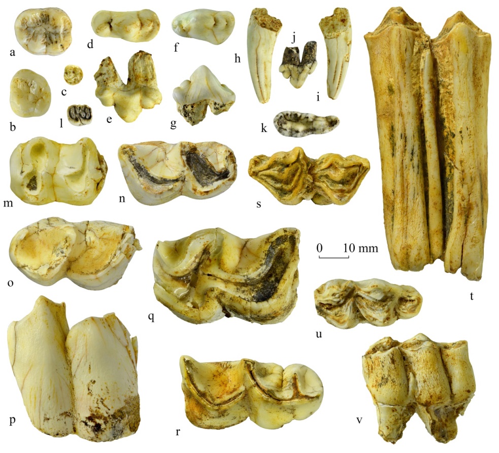 The wild boar, Sus scrofa, has been recorded in Southwest Asia since the Early Pleistocene [3]. The bearded pig, S. barbatus, as a fossil was found in the Middle and Upper Pleistocene of Thailand, the Upper Pleistocene of Vietnam, Laos, Malaysia, and Indonesia, including Sumatra, Java, and Borneo; in a number of localities, like the Lang Trang cave, it co-occurred with a wild boar [3, 11, 15]. The Lesser oriental chevrotain, Tragulus kanchil, a member of the archaic Tragulidae family, inhabits the tropical forests of Southeast Asia, in modern days ranges from ca. 18° N latitude south to Sumatra, Borneo and the Sunda Isles.This species is represented by a single find [8]. The water deer, Hydropotes inermis, was also identified from a single finding of a tooth with a characteristic structure [8]. Nowadays this species occurs in the east of China (in the Yangtze River basin) and in Korea. It has been known since the Early Pleistocene in China, but in Southeast Asia it was discovered for the first time. The hog deer, Axis porcinus, represented in the Lang Trang locality by a few remains, has been known in Southeast Asia since the Middle Pleistocene. The remains of the southern red muntjac, Muntiacus muntjak, the sambar deer, Rusa unicolor, and the serow, Capricornis sumatraensis, are more numerous. The larger deer, muntjac and sambar, have been widely represented on the continental part of Southeast Asia since the Middle Pleistocene, and in the Late Pleistocene they settled on the Greater Sunda Isles [15]. The serow, nowadays inhabiting mountains from Eastern Tibet and Northern India to South China and Southeast Asia (as far as Sumatra), has been known in China since the Early Pleistocene, and in Southeast Asia from the Middle Pleistocene [3, 15]. In 2022 finds from the Lang Trang the large bovid are represented by two forms, Bubalus arnee and Bos sp. (Figs 1s-1v).