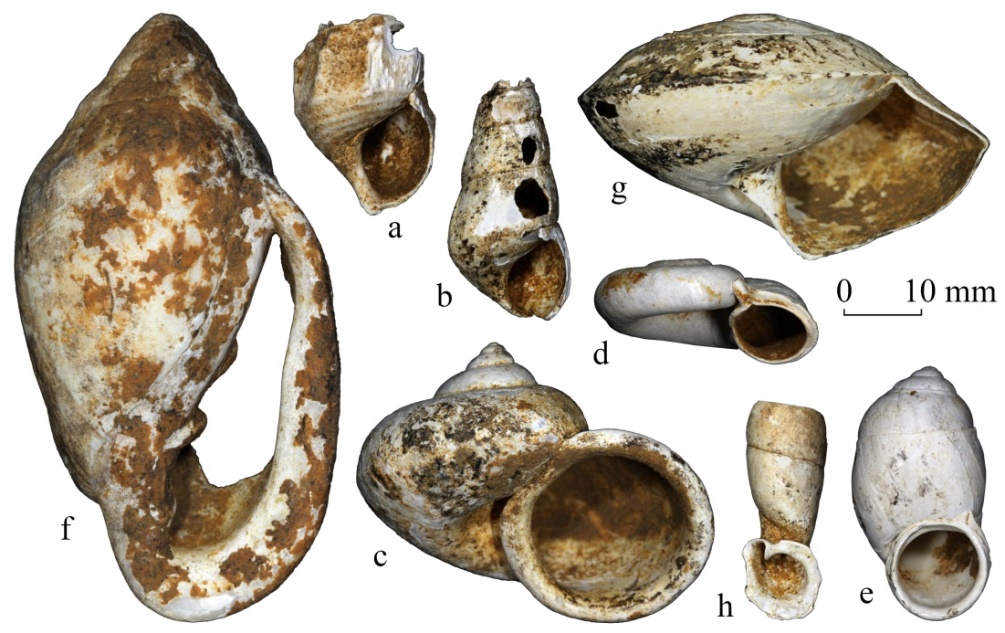 The mollusk assemblage from the Lang Trang cave includes recent species that nowadays occur in northern Vietnam and represents a mixture of terrestrial, freshwater and coastal marine forms (Fig. 2). The following species are determined in the assemblage: terrestrial Pollicaria rochebruni (Mabille, 1887), Cyclophorus fasciatus Kobelt, 1908, Cyclophorus sp., Rhiostoma morleti (Dautzenberg et Fischer, 1906), Megalauchenia proctostoma (Mabille, 1889), and Camaena cf. vanbuensis Smith, 1896, freshwater Brotia jullieni (Deshayes, 1874) and Sulcospira cf. collyra Köhler et al., 2009, and shallow water marine species Ellobium aurismidae (Linnaeus, 1758). E. aurismidae is widely distributed along the coastal regions of the Western Pacific (Vietnam, Thailand, Philippines, Malaysia, Indonesia, and south to northern Australia), where it frequents coastal mangroves and river estuaries, living in grass on mudflats, as well as on the roots and trunks of mangroves and Nypa mangrove palms in the littoral and supralittoral zones [10]. The presence of this species makes possible to synchronize the time of accumulation of the studied deposits with the episode of the largest marine transgression in the Late Pleistocene (MIS 5e, ca. 125 ka BP) [20], when the sea line has approached the cave area (currently, the Lang Trang cave is over 90 km away from the sea coast, and about 60 m above the sea level). The finds of terrestrial mollusks, Pollicaria, Cyclophorus, Rhiostoma, Megalauchenia, and Camaena, in the assemblage can be explained by their transportation from the elevated areas by streams and rivers, which is confirmed by the co-occurrence with freshwater forms of the genera Brotia and Sulcospira.