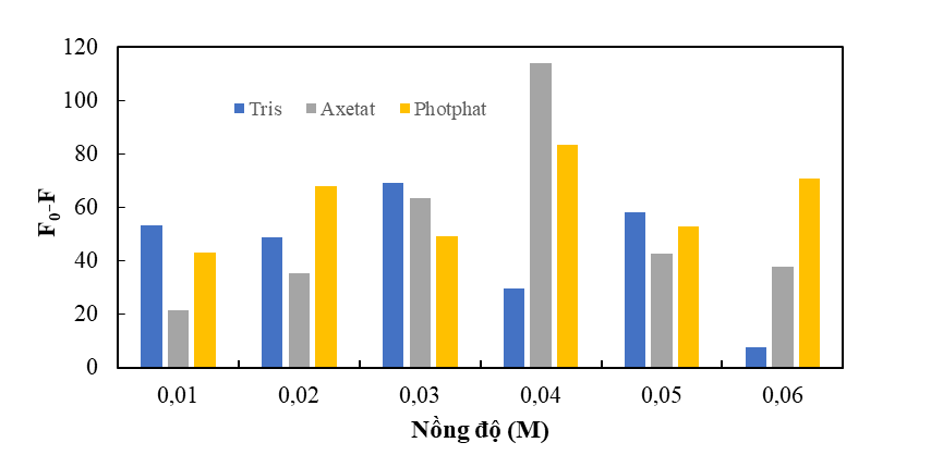 Các dung dịch đệm khác nhau bao gồm dung dịch đệm tris (hydroxymethyl)-aminomethan, photphat và axetat được khảo sát với nồng độ đệm thay đổi trong khoảng 0,01 - 0,06 M. Kết quả cho thấy giá trị cao nhất đối với thông số F0-F được quan sát thấy với dung dịch đệm axetat (0,04 M; pH 4) và dung dịch đệm này sẽ được lựa chọn cho các thí nghiệm tiếp theo.