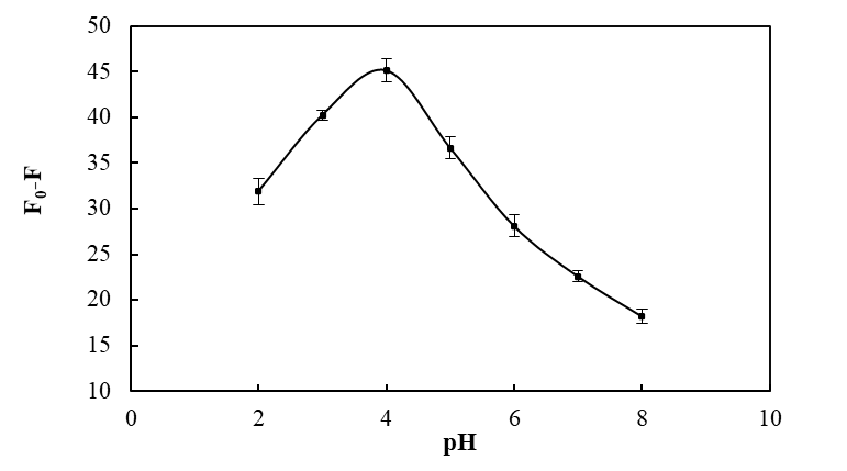 pH là một trong các yếu tố quan trọng ảnh hưởng đến tín hiệu huỳnh quang của CQDs-SiO2@MIP khi có mặt chất phân tích. Kết quả khảo sát ảnh hưởng của pH trong khoảng từ 2 đến 8 cho thấy tín hiệu huỳnh quang của dung dịch CQDs-SiO2@MIP khi có mặt naproxen phụ thuộc tương đối đáng kể vào pH (Hình 5). Giá trị F0 -F đạt cực đại ở pH 4 sau đó giảm dần khi thay đổi pH từ 4 xuống 8. Sự giảm tín hiệu ở pH > 4 có thể được giải thích do tại các giá trị pH này, lớp vỏ silica có thể bị ion hóa và xuất hiện các khuyết tật bề mặt làm giảm tín hiệu huỳnh quang. Kết quả này còn cho thấy việc dập tắt huỳnh quang không chỉ phụ thuộc vào tương tác tĩnh điện mà còn phụ thuộc vào các tương tác khác như liên kết hydro [12].