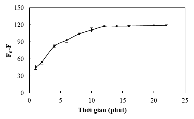 Ảnh hưởng của thời gian đến tín hiệu huỳnh quang của dung dịch CQDs-SiO2@MIP khi thêm naproxen được khảo sát trong 22 phút. Kết quả thực nghiệm cho thấy tín hiệu huỳnh quang ở bước sóng 430 nm tăng dần trong khoảng 15 phút và sau đó không thay đổi. Vì vậy, 15 phút là thời gian tối ưu được lựa chọn để phát hiện và định lượng naproxen.