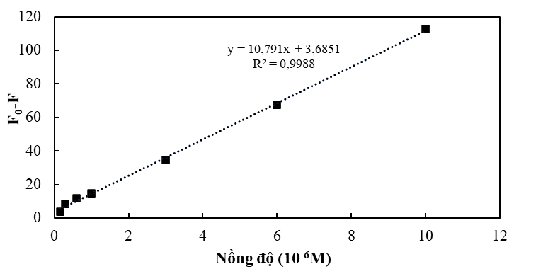 10-7 đến 10-5 M. Xây dựng đường chuẩn trong khoảng nồng độ này thu được phương trình: (F0-F) = 10,791xCnaproxenx10-6 + 3,6851; hệ số tương quan cao R2 = 0,9988.