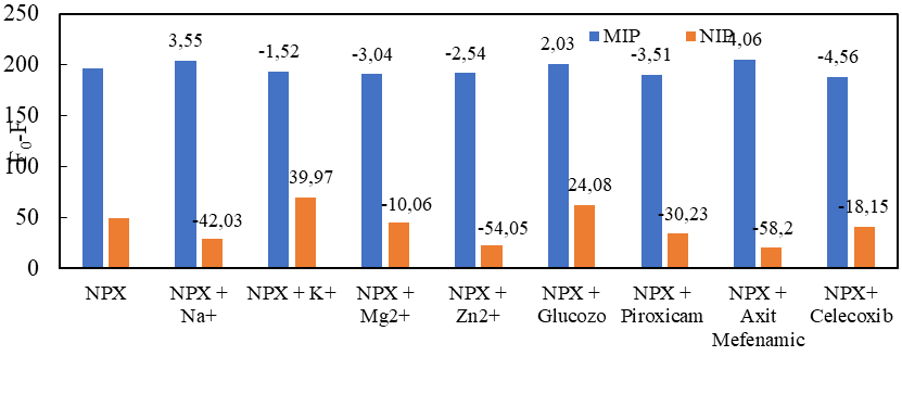 Một trong những thông số phân tích quan trọng của sensor là tính chọn lọc. Để đánh giá độ chọn lọc của phương pháp trong điều kiện tối ưu, tín hiệu huỳnh quang của CQDs-SiO2@MIP, CQDs-SiO2@NIP khi có mặt của các chất khác nhau như K+, Mg2+, Ca2+, Zn2+, glucose, piroxicam, axit mefenamic đã được khảo sát và biểu diễn trong Hình 8. Sự sai lệch về tín hiệu huỳnh quang từ 1,52 % ÷ 4,56 % khi có mặt các chất ảnh hưởng cho thấy khả năng hấp phụ chọn lọc cao các phân tử naproxen lên trên các lỗ trống của bề mặt CQDs-SiO2@MIP (in dấu phân tử) so với sai lệch từ 10,06 % ÷ 58,2 % của CQDs-SiO2@NIP (không in dấu phân tử).