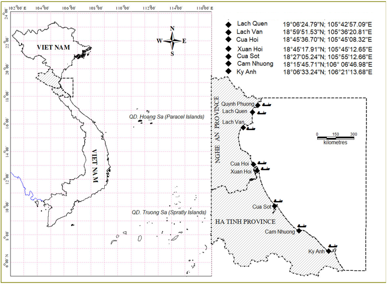 2.2.1. Địa điểm thu mẫu: Tỉnh Nghệ An: Cửa Hội (Cửa Lò); Lạch Quèn (Quỳnh Phương/Quỳnh Lưu); Lạch Vạn (Diễn Châu). Tỉnh Hà Tĩnh: Cẩm Nhượng (Cẩm Xuyên); Cửa Sót (Lộc Hà); Kỳ Phương (Kỳ Anh); Xuân Hội (Nghi Xuân).