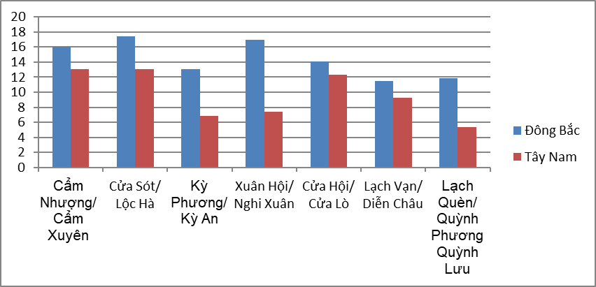 Kết quả điều tra theo phương pháp đánh giá nhanh có sự tham gia cộng đồng tại Nghệ An là 689 phiếu ở 3 khu vực: Cửa Lò; Diễn Châu; Quỳnh Lưu. Tại Hà Tĩnh là 155 phiếu ở 4 khu vực: Nghi Xuân; Lộc Hà; Cẩm Xuyên; Kỳ Anh thể hiện ở Bảng 1.