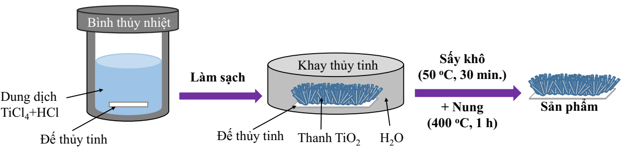 20 mL HCl (6M) và 0,4 mL TiCl4 được cho vào trong bình chứa teflon (100 mL) và khuấy từ từ trong thời gian 30 phút với nhiệt độ được duy trì ở khoảng 3 ÷ 5oC. Sau đó, các đế thủy tinh với kích thước (1 cm x 1 cm) được đặt nằm ngang vào trong bình chứa thủy nhiệt Teflon và được cho vào lò nhiệt và giữ ở nhiệt độ 160oC với thời gian thủy nhiệt là 18 giờ. Sau khi nhiệt độ của lò giảm tới nhiệt độ phòng, các mẫu được lấy ra khỏi lò nhiệt và được làm sạch bằng nước khử ion và sấy sơ bộ ở 50oC trong thời gian 30 phút. Cuối cùng, các mẫu được nung trong môi trường không khí ở nhiệt độ 400oC trong 1 giờ. Kết quả thu được là lớp màng trắng TiO2 được hình thành trên đế thủy tinh.