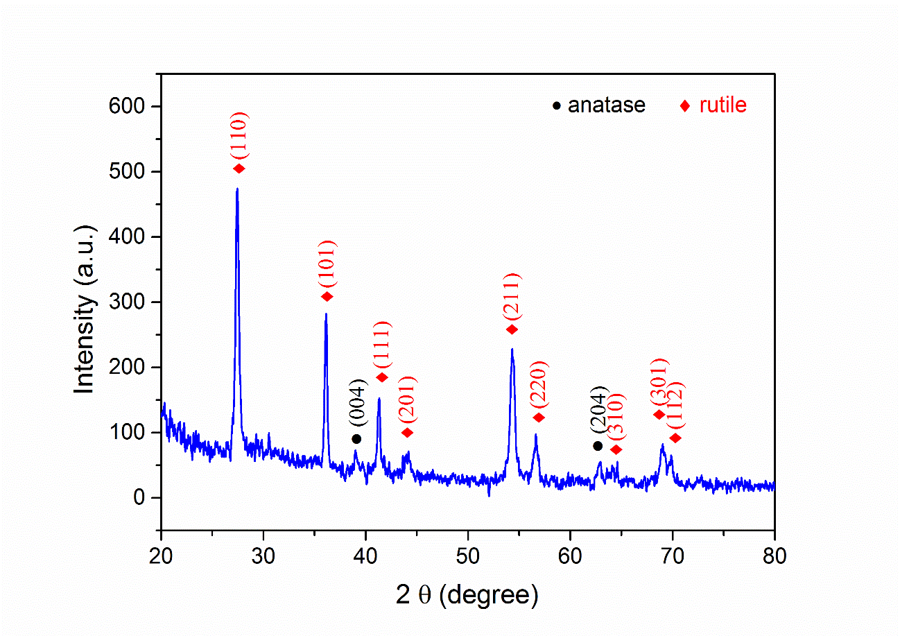 Hình 4 là giản đồ nhiễu xạ tia X của các thanh TiO2. Kết quả đo cho thấy, có sự xuất hiện của cả hai pha rutile và anatase trong mẫu TiO2 thu được. Các đỉnh nhiễu xạ tại các góc 2θ = 27,44o, 36,18o, 41,34o, 44,02o, 54,34o, 56,68o, 64,58o, 69,06o và 69,88o ứng với các mặt tinh thể (110), (101), (111), (201), (211), (220), (310), (301) và (112) của tinh thể rutile TiO2 [14]; trong khi đó các đỉnh nhiễu xạ tại các góc 2θ = 38,99o và 62,93o ứng với các mặt tinh thể (004) và (204) của tinh thể anatase TiO2 [13].