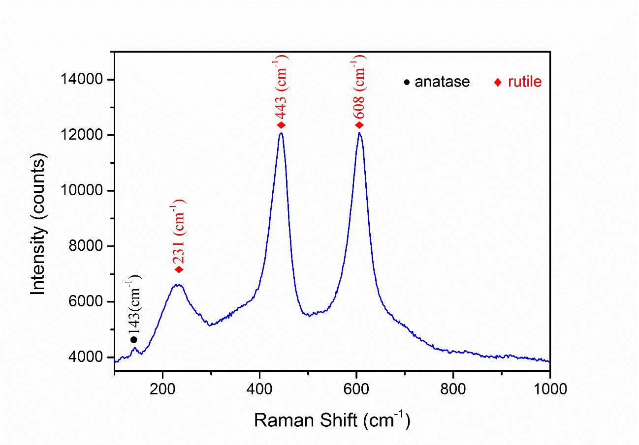 Sự tồn tại của cả hai pha tinh thể rutile và anatase của các thanh TiO2 cũng đã được khẳng định thông qua phép đo tán xạ micro Raman. Hình 5 là kết quả đo phổ Raman của mẫu TiO2 sau khi được tổng hợp với dải đo từ 100 cm-1 ÷ 1000 cm-1. Kết quả nghiên cứu cho thấy mẫu TiO2 thu được có sự xuất hiện của cả hai pha: rutile, ứng với sự xuất hiện của các đỉnh phổ tại các số sóng: 608 cm-1, 443 cm-1 và 231 cm-1 và anatase, ứng với sự xuất hiện của đỉnh phổ tại số sóng: 143 cm-1. Cường độ đỉnh phổ Raman thể hiện cấu trúc tinh thể của vật liệu thu được. Như vậy có thể thấy, các thanh TiO2 có cấu trúc pha rutile vượt trội so với pha anatase.