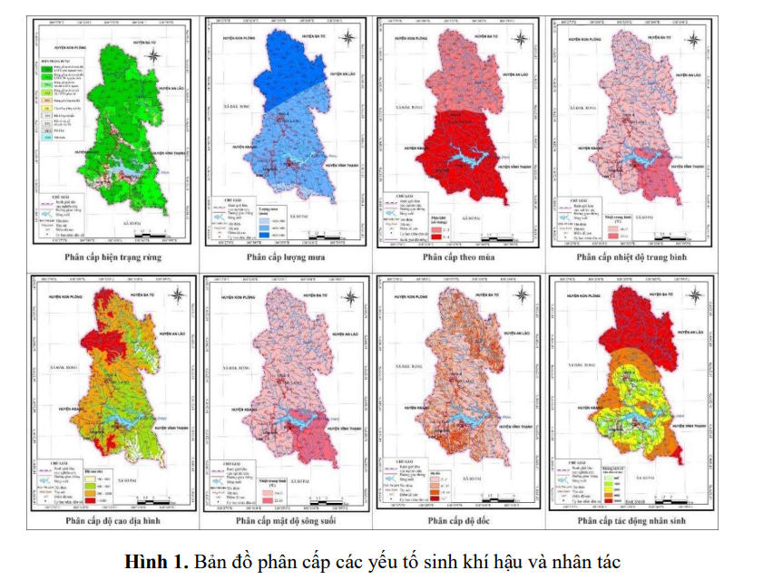 - Phương pháp kiểm nghiệm đánh giá mức độ thích nghi sinh thái: Ứng dụng hệ thống thông tin địa lý (GIS) và phương pháp phân tích thứ bậc (AHP) nhằm kiểm nghiệm, đánh giá mức độ thích nghi sinh thái đối với các loài cây lâm nghiệp bản địa được lựa chọn. Phân tích đa chỉ tiêu sinh thái - khí hậu cho mỗi loài cây lâm nghiệp bản địa theo các cấp độ đánh giá từ mức kém thích nghi (Mức 1), thích nghi (Mức 2: Thích nghi - 2.1 và Rất thích nghi - 2.2). Các chỉ tiêu sinh thái, khí hậu, nhân tác được phân cấp và thể hiện tại Hình 1. Trên cơ sở kết quả phân tích đa tiêu chí, đối chiếu với hiện trạng về điều kiện về sinh khí hậu (Khí hậu, thuỷvăn, thổnhưỡng, địa hình) và tác động nhân sinh nhằm đánh giá mức độ thích nghi của các loài được lựa chọn trồng bổ sung, phục hồi rừng tại khu vực nghiên cứu.