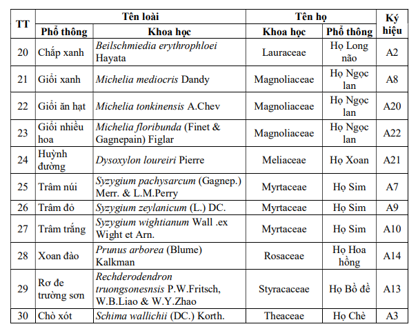 Theo các nhóm tiêu chí chọn loài cây trồng phục hồi rừng tự nhiên, trên cơ sở: Kết quả điều tra, khảo sát thực địa; Danh lục thực vật được ghi nhân tại khu vực nghiên cứu; Danh mục các loài cây triển vọng trồng và phục hồi rừng ở Tây Nguyên [9]; Kiến thức, kinh nghiệm của cộng đồng địa phương; Ý kiến chuyên gia và các kết quả nghiên cứu trong lựa chọn loài cho trồng và phục hồi rừng nhiệt đới trong và ngoài nước: Tổ chức gỗ nhiệt đới quốc tế (ITTO, 2022) [10]… nhóm 30 loài cây lâm nghiệp bản địa triển vọng cho trồng bổ sung phục hồi rừng tự nhiên khu vực nghiên cứu được chỉ ra tại Bảng 1.