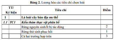 Lượng hóa các tiêu chí: Từ kết quả điều tra thực địa, tham khảo tài liệu vềđặc điểm sinh học, sinh thái của loài [3, 8 - 20], kết hợp tham khảo ý kiến chuyên gia, các nhóm tiêu chí chọn loài được cụ thể hóa bằng 8 tiêu chí, gồm: (1) Kiểu thảm thực vật loài phân bố; (2) Ý kiến chuyên gia, chủ rừng và cộng đồng; (3) Giá trị bảo tồn; (4) Giá trị sinh thái; (5) Giá trị kinh tế; (6) Nguồn giống và kỹ thuật/kinh nghiệm nhân giống, gây trồng; (7) Khả năng thích nghi với điều kiện vi lập địa tại khu vực phục hồi rừng; (8) Đặc tính sinh trưởng và khả năng tái sinh tự nhiên. Các tiêu chí được đánh giá định tính bằng cách cho điểm theo 3 mức được chỉ ra tại Bảng 2.