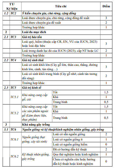+ Xác định tiêu chí: Nhóm tiêu chí 1 - Là loài cây lâm nghiệp bản địa ưu thế, gồm 2 tiêu chí: (1) Kiểu thảm thực vật loài phân bố; (2) Ý kiến chuyên gia, chủ rừng, cộng đồng; Nhóm tiêu chí 2 - Là loài đa mục đích, gồm 3 tiêu chí: (3) Giá trị bảo tồn; (4) Giá trị sinh thái; (5) Giá trị kinh tế; Nhóm tiêu chí 3 - Khả năng gây trồng, gồm 3 tiêu chí: (6) Nguồn giống và kỹ thuật/kinh nghiệm nhân giống, gây trồng; (7) Khả năng thích nghi với điều kiện vi lập địa tại khu vực phục hồi rừng; (8) Đặc tính sinh trưởng và khả năng tái sinh tự nhiên [8, 9];