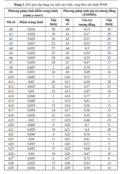 Kết quả tại Bảng 3 cho thấy, mô hình WSM từ hai phương pháp xếp hạng khác nhau đều cho kết quả tương đồng. Nhóm 5 mã loài có điểm cao nhất, thứ tựnày không đổi ở cả hai phương pháp xếp hạng, bao gồm các loài Xoan nhừ(Choerospondias axillaris) - A15; Giổi xanh (Michelia mediocris) - A8; Xoan đào (Prunus arborea) - A14; Giổi nhiều hoa (Michelia floribunda) - A22 và Trắc (Dalbergia cochinchinensis) - A24. Kết quả phân tích đa tiêu chí cho thấy, đây là những loài cây được đánh giá đáp ứng tốt nhất các nhóm tiêu chí về cây bản địa ưu thế, đa tác dụng và triển vọng gây trồng bổ sung phục hồi rừng tự nhiên trên đất trống, trảng cây bụi sau nương rẫy hoặc sau khai thác kiệt. Phần lớn các loài được chọn như: Giổi xanh, Xoan đào, Xoan nhừ đã được nghiên cứu trồng rừng cây bản địa ở nhiều vùng, trong đó có khu vực Tây Nguyên [6, 9, 10, 16, 17]. Bên cạnh đó, một số loài cây lâm nghiệp bản địa như: Trâm trắng (Syzygium wightianum), Giổi ăn hạt (Michelia tonkinensis), Gõ đỏ (Afzelia xylocarpa), Thành ngạnh (Cratoxylum formosum), Ràng ràng bóng (Ormosia balansae), Xoay (Dialium cochinchinense)… tuy có những ưu nhược điểm nhưng đều là những loài rất triển vọng cho trồng bổsung phục hồi rừng tự nhiên tại khu vực nghiên cứu (xếp hạng từ 6 đến 11).