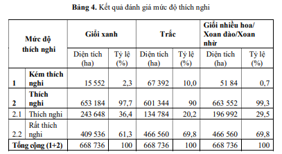 Từ số liệu trong Bảng 4 cho thấy, các loài được chọn có khả năng thích nghi tốt, tỷ lệ từ 90%. Trong đó, các loài Giổi nhiều hoa, Xoan đào, Xoan nhừ có biên độ, mức độ thích nghi sinh thái rộng chiếm 99,3%, tương đương với 663 552 ha. Giổi xanh có tỷ lệ thích nghi là 97,7%, với 653 184 ha. Trắc là loài có mức độ thích nghi hẹp nhất trong nhóm này, với 10% kém thích nghi, tương đương với 67 392 ha, nhưng có diện tích ở mức độ rất thích nghi thuộc nhóm cao nhất, tới 69,8% (466 560 ha).