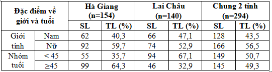 Phân tích 294 đối tượng nghiên cứu đã khảo sát ở Bảng 1 cho thấy đối tượng ở Lai Châu chiếm tỷ lệ 47,6% và ở Hà Giang là 52,4%. Phân bố theo giới tính cho thấy nam giới chiếm 43,5% và nữ giới chiếm 56,5% trong đó tại Hà Giang tỷ lệ nam giới và nữ giới lần lượt là 40,3% và 59,7%, tại Lai Châu tỷ lệ này lần lượt là 47,1% và 52,9%. Phân tích theo độ tuổi có 145 trường hợp từ 45 tuổi trở lên, chiếm 49,3% và nhóm tuổi từ 18-44 là 149 trường hợp, chiếm 50,7%. Trong đó, tỷ lệ theo nhóm tuổi ≥ 45 tại Hà Giang và Lai Châu lần lượt là 64,3% và 32,9%. Như vậy, số mẫu nghiên cứu phân bố tương đối đồng đều theo địa điểm, giới tính và nhóm tuổi.