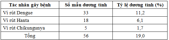 - Trong 294 mẫu nghiên cứu, tỷ lệ dương tính huyết thanh học vi rút Dengue, vi rút Hanta và vi rút Chikungunya virus lần lượt là 11,2%, 6,1% và 1,7%. Ngoài ra, 4 trường hợp đồng nhiễm chiếm tỷ lệ 1,4%, trong đó có 2 trường hợp đồng nhiễm vi rút Dengue và vi rút Hanta và 2 trường hợp đồng nhiễm vi rút Dengue và vi rút Chikungunya.
