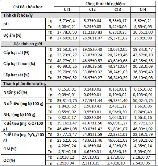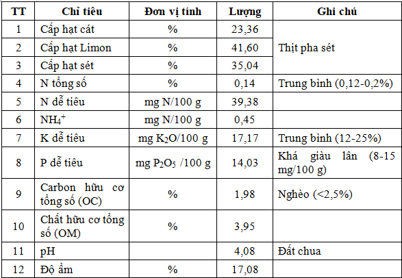 Các yếu tố liên quan đến tính chất hóa lý (pH, độ ẩm), thành phần cơ giới (tỷ lệ các hạt cát, limon và sét) và thành phần dinh dưỡng (C, N, P) được xác định ở hai thời điểm trước và sau thí nghiệm. Đất sử dụng trong thí nghiệm là đất đồi chè đã bị thoái hóa, thuộc loại đất thịt pha sét (có tỷ lệ hạt cát thấp), đất chua (pH ~4) và có hàm lượng carbon hữu cơ tổng số thấp (OM<2,5%) (Bảng 1). Trong thí nghiệm trồng cây, việc trộn đất với giá thể nghèo dinh dưỡng đã cải thiện một phần thành phần cơ giới và dinh dưỡng của đất bao gồm K dễ tiêu, P dễ tiêu, OM và OC (xem các chỉ tiêu phân tích đất ban đầu ở Bảng 1 và tại thời điểm bắt đầu thí nghiệm ở công thức đối chứng CT1 trong Bảng 3.