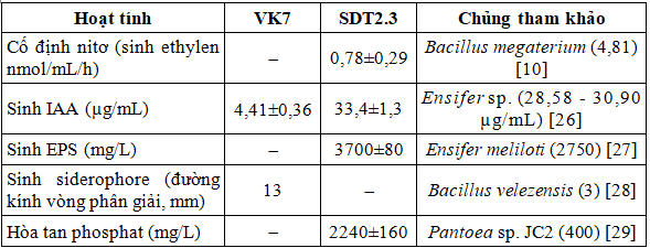 Hai chủng VK7 và SDT2.3 thể hiện nhiều đặc tính có lợi cho đất và cây trồng ở các mức độ khác nhau (Bảng 2). Chủng VK7 có hoạt tính sinh IAA và sinh siderophore, có tác dụng kích thích sinh trưởng và tăng sức đề kháng của cây. Chủng SDT2.3 có các hoạt tính cố định nitơ, sinh IAA, sinh EPS và hòa tan phosphat, có tác dụng trong cải thiện chất lượng đất cũng như tăng trưởng của cây.