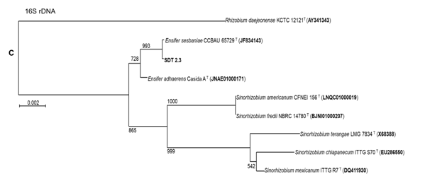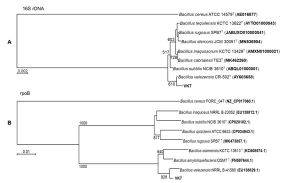 Vị trí phân loại của hai chủng vi khuẩn VK7 và SDT 2.3 được xác định dựa trên so sánh trình tự gen 16S rDNA (1500 bp). Kết quả cho thấy chủng SDT2.3 gần gũi với loài Ensifer sesbaniae (100% tương đồng) với giá trị bootstrap gần như tuyệt đối 993/1000 (Hình 1C), và chủng VK7 gần gũi với loài Bacillus velezensis (99,86% tương đồng) với giá trị bootstrap 810/1000 (Hình 1A). Để có thể định danh chủng VK7 chính xác hơn chúng tôi đã tiến hành giải trình tự gen rpoB (1100 bp) như một chỉ thị phân tử khác ngoài gen 16S rDNA. Dựa trên so sánh gen rpoB, chủng VK7 có quan hệ gần gũi nhất với loài Bacillus velezensis (tương đồng 99,38%) với giá trị bootstrap 928/1000 (Hình 1B). Kết quả này hoàn toàn thống nhất với kết quả phân tích và so sánh trình tự gen 16S rDNA của chủng VK7 ở trên.