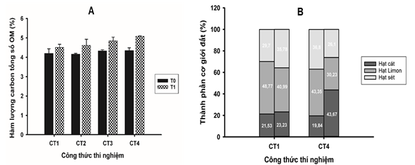 Hình 2. Hàm lượng chất hữu cơ tổng số (OM) (A) và thành phần cơ giới (B) trong đất ở thời điểm đầu và kết thúc