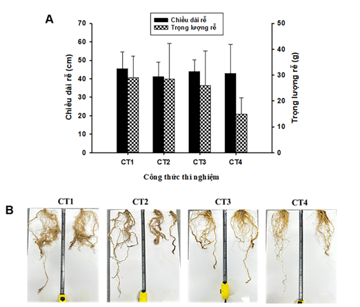 Hình 3. Tăng trưởng rễ cây cà chua trong các công thức thí nghiệm. A. Chiều dài rễ trung bình và trọng lượng rễ trung bình; B. Hình ảnh hệ rễ của các cây cà chua từ các công thức thí nghiệm