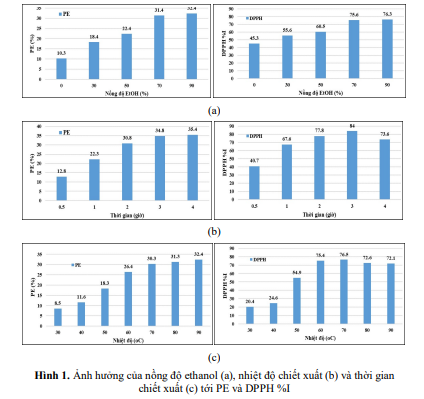 Tác động của nồng độ ethanol khác nhau (0%, 30%, 50%, 70%, 90%) đến PE và DPPH %I được tiến hành ở 70°C trong 2 giờ. Kết quả cho thấy, giá trị PE và DPPH %I đều tăng theo nồng độ ethanol (Hình 1a). Khi tăng giá trị %EtOH từ 0 đến 70%, PE tăng nhanh từ 10,3% lên 31,4%, tương tự, giá trị DPPH %I cũng tăng từ 45,3% lên 75,6%