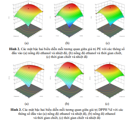 Phân tích các đồ họa mô phỏng 3D (Hình 2), ảnh hưởng của nồng độ ethanol, nhiệt độ và thời gian đến hiệu suất chiết PE và giá trị DPPH %I được thể hiện rõ. Giá trị DPPH %I tăng mạnh khi tăng nồng độ ethanol từ 0-70% và giảm khi nồng độ > 70% (Hình 2a).