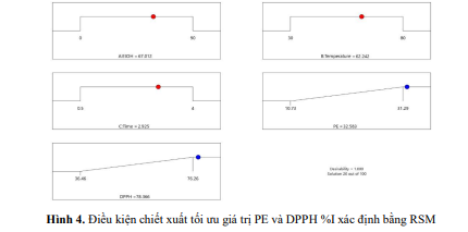 Hình 4. Điều kiện chiết xuất tối ưu giá trị PE và DPPH %I xác định bằng RSM