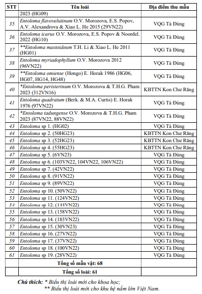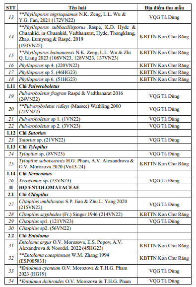 Kết quả nghiên cứu đã ghi nhận được tổng số 61 loài thuộc 14 chi, 2 họBoletaceae và Entolomataceae trong tổng số 68 mẫu vật thu được ở 2 địa điểm nghiên cứu. Danh lục loài chi tiết được thể hiện ở Bảng 1.