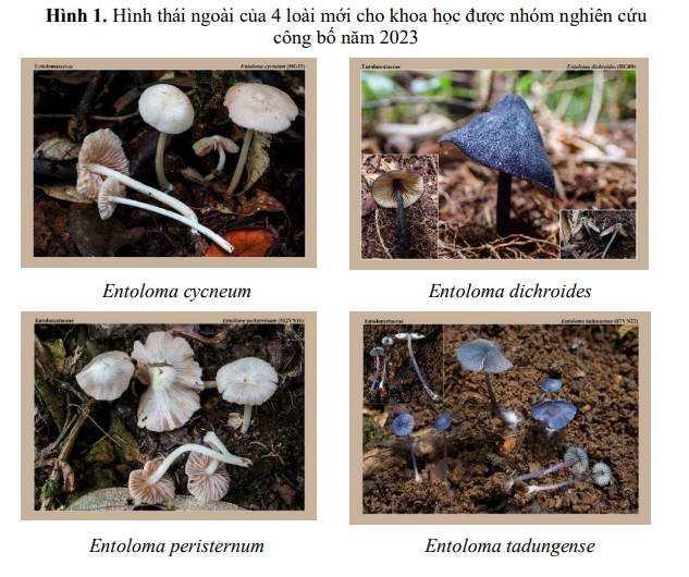 Research on the biological and ecological characteristics of fungi belonging to the Boletaceae and Entolomataceae families (genus Entoloma) has contributed to the description of 4 new species to science belonging to the family Entolomataceae, genus Entoloma: Entoloma cycneum, Entoloma dichroides, Entoloma peristerinumand Entoloma tadungense; 10 new species recorded for the large fungal flora of Vietnam: 7 species of the Boletaceae family: Cyanoboletus flavocontextus, Boletus mirabilis, Phylloporus nigrisquamus, Phylloporus hainanensis, Phylloporus subbacillisporus, Pulveroboletus ridleyi, Kgaria virescens; 3 species belong to the genus Entoloma (family Entolomataceae): Entoloma caespitosum, Entoloma mastoideum and Entoloma omiense. This is the scientific basis to propose solutions and policies for management, conservation and development of large fungal species in particular and biodiversity in general.