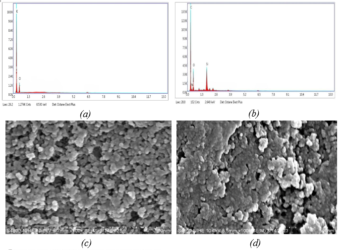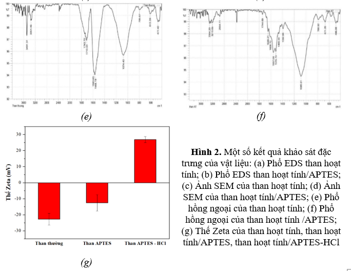 Cấu trúc vi mô của than hoạt tính (Hình 2c) và than hoạt tính/APTES (Hình 2d) được thể hiện trong ảnh chụp SEM. Các hạt than hoạt tính khá đồng đều với kích thước khoảng 30 nm. Khi than được biến tính bề mặt bằng APTES, kích thước của vật liệu không thay đổi, cho thấy quy trình biến tính than hoạt tính bằng APTES không làm thay đổi cấu trúc vi mô của vật liệu. Tuy nhiên bề mặt than sau khi biến tính nhẵn hơn, có thể do lớp phủ của APTES trên bề mặt.